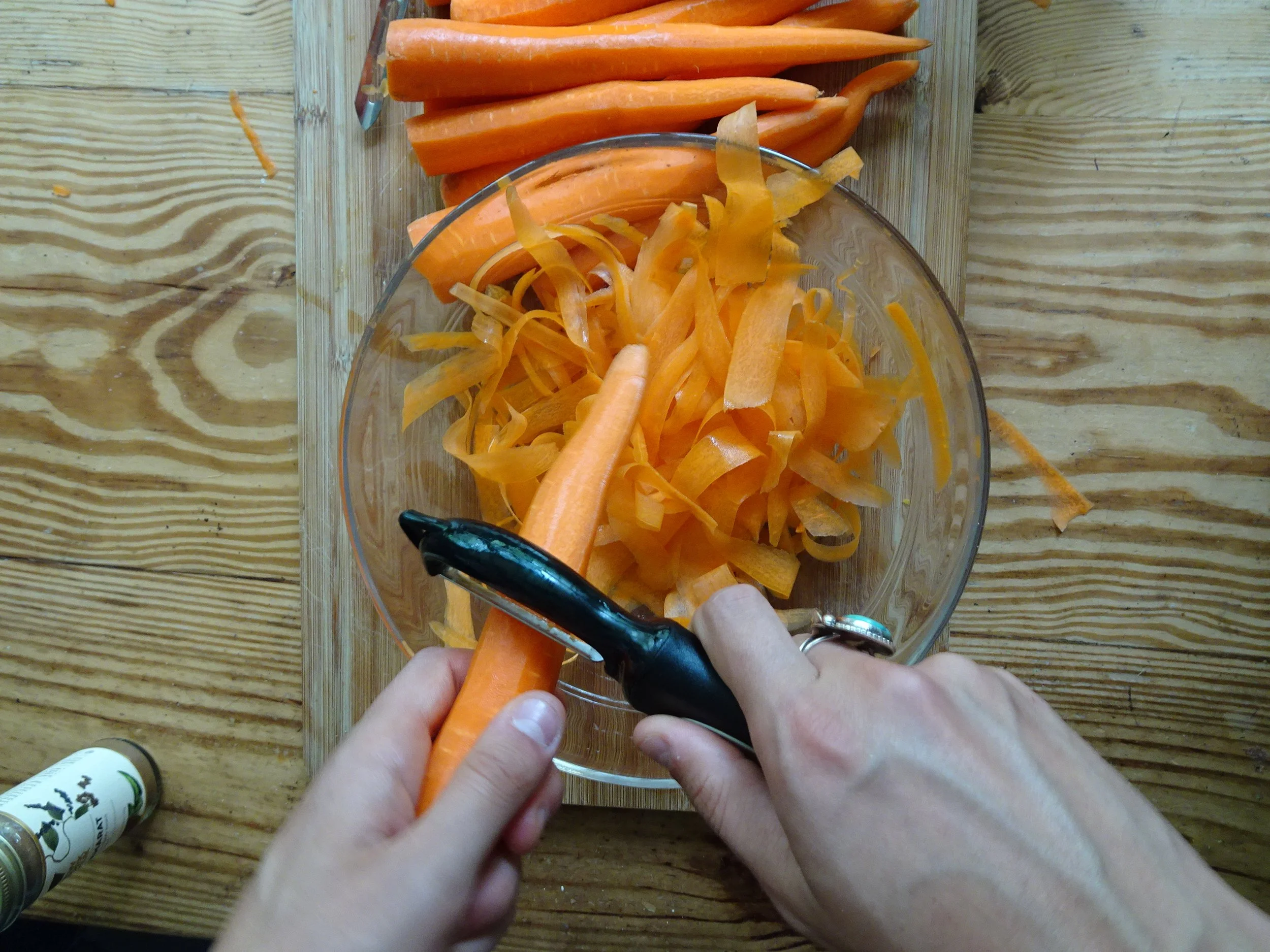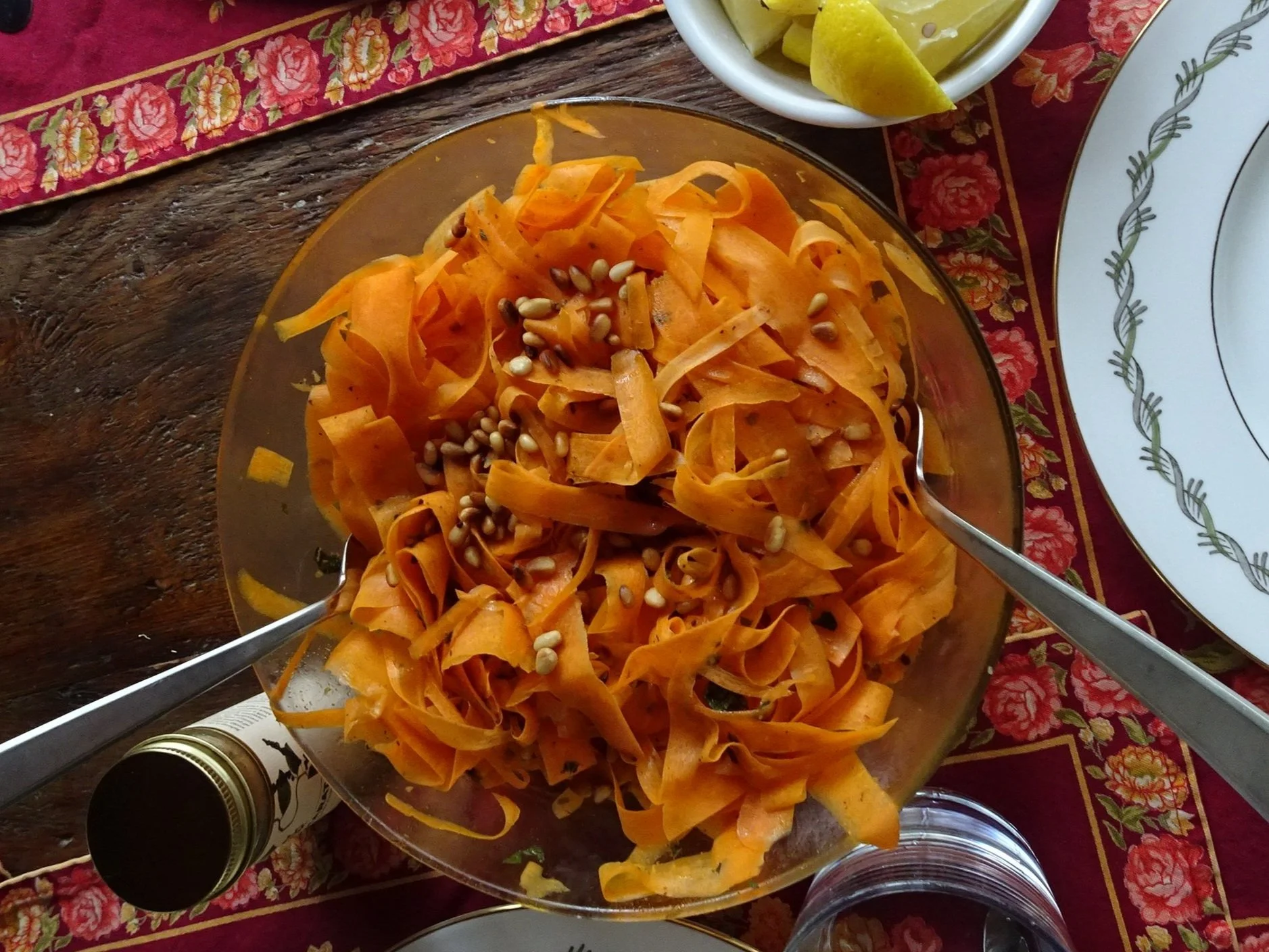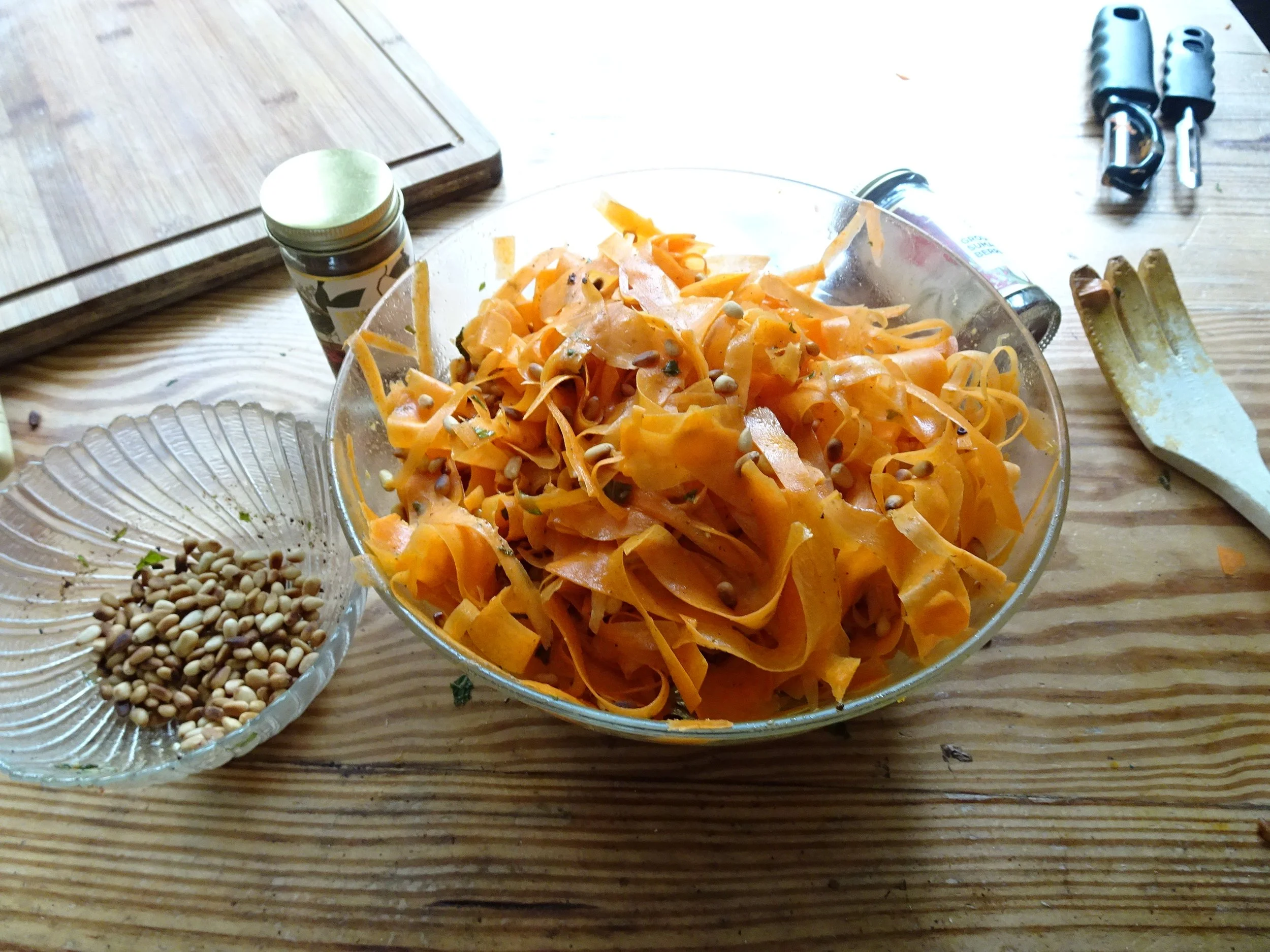 Use a vegetable peeler to shave the carrots into long, thin ribbons. In a large bowl, whisk together the olive oil, red wine vinegar, baharat, sumac, garlic, salt, and pepper. Add the carrot ribbons and toss well to coat. Fold in about half of the mint and pine nuts. Transfer to a serving dish and finish with the remaining mint and pine nuts on top.