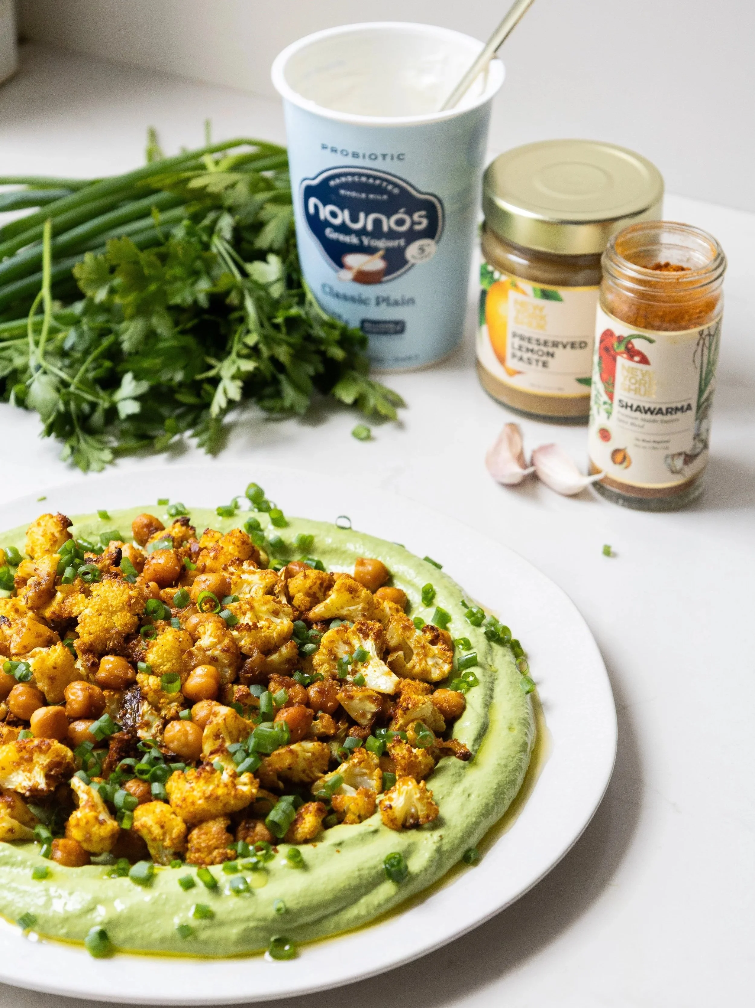 Quick dinner or dinner party centerpiece—this one does it all. Cool, creamy Nounós Creamery Greek Yogurt meets bright, citrusy New York Shuk Preserved Lemon Paste in a vibrant green tahini sauce, the perfect base for warmly spiced cauliflower and chickpea shawarma.