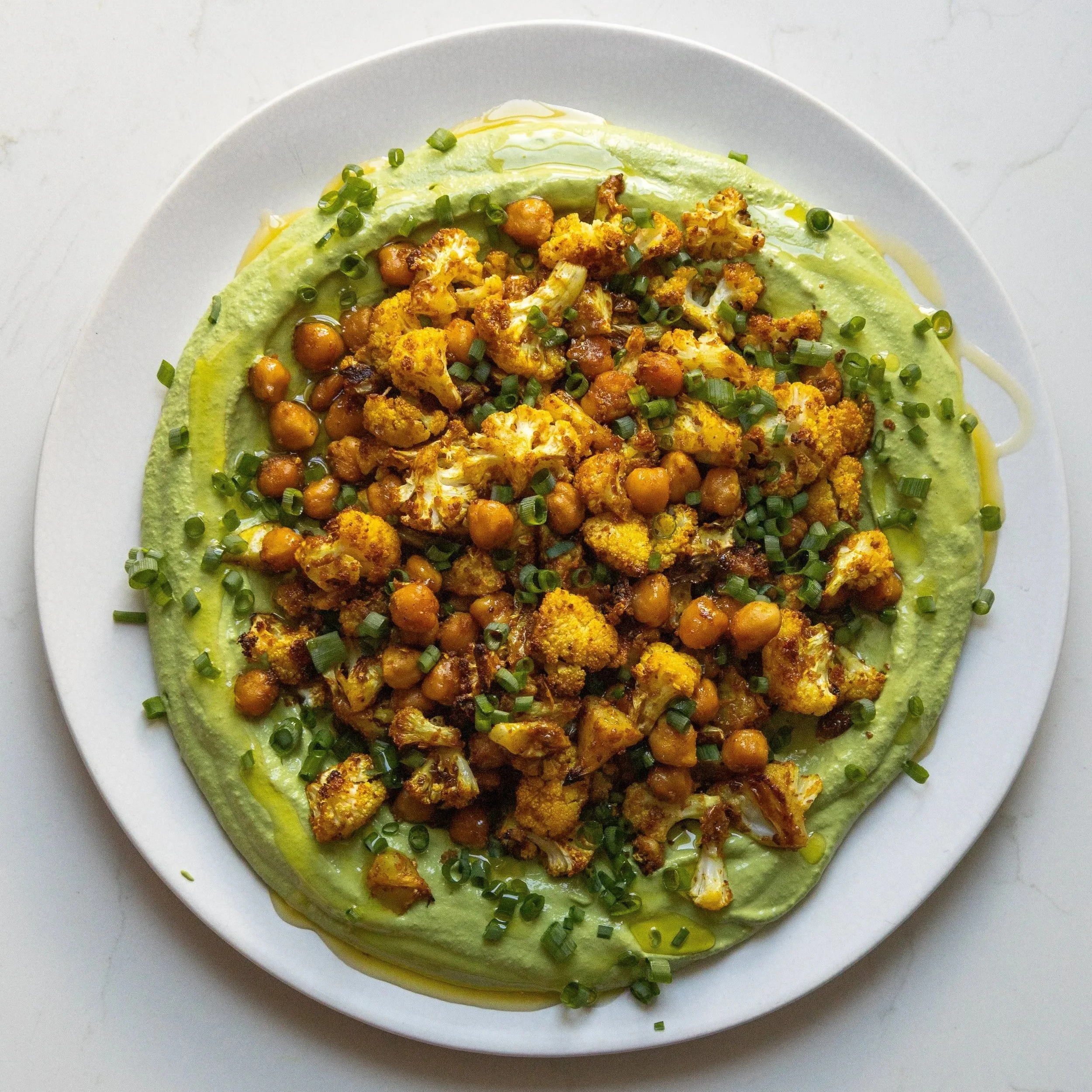 To assemble, spread the Green Tahini Yogurt on a serving platter. Top with the roasted cauliflower and chickpeas, drizzle with a little olive oil if desired, and sprinkle with scallions. Serve warm or at room temperature.