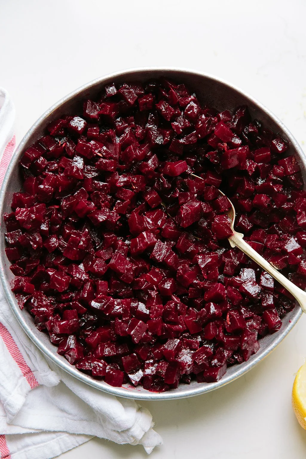 Peel off the beet skins with your hands or a pairing knife, leaving a little of the char on to add flavor. Cut into small cubes, and toss in a mixing bowl with the salt, olive oil, cumin, and preserved lemon paste. Taste and adjust seasoning as desired.
