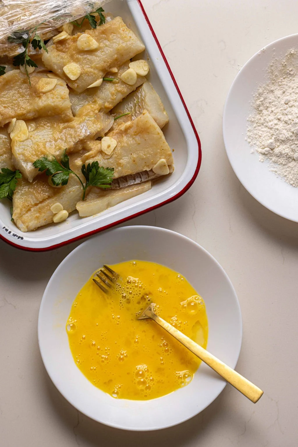 Meanwhile, put the flour in a shallow bowl. In another shallow bowl, beat the eggs together. Remove the cod fillets from the baking dish; do not scrape off the marinade. Working in batches as needed to prevent overcrowding, add the fillets to the flour, coating them completely and shaking off the excess, then dip into the beaten eggs.