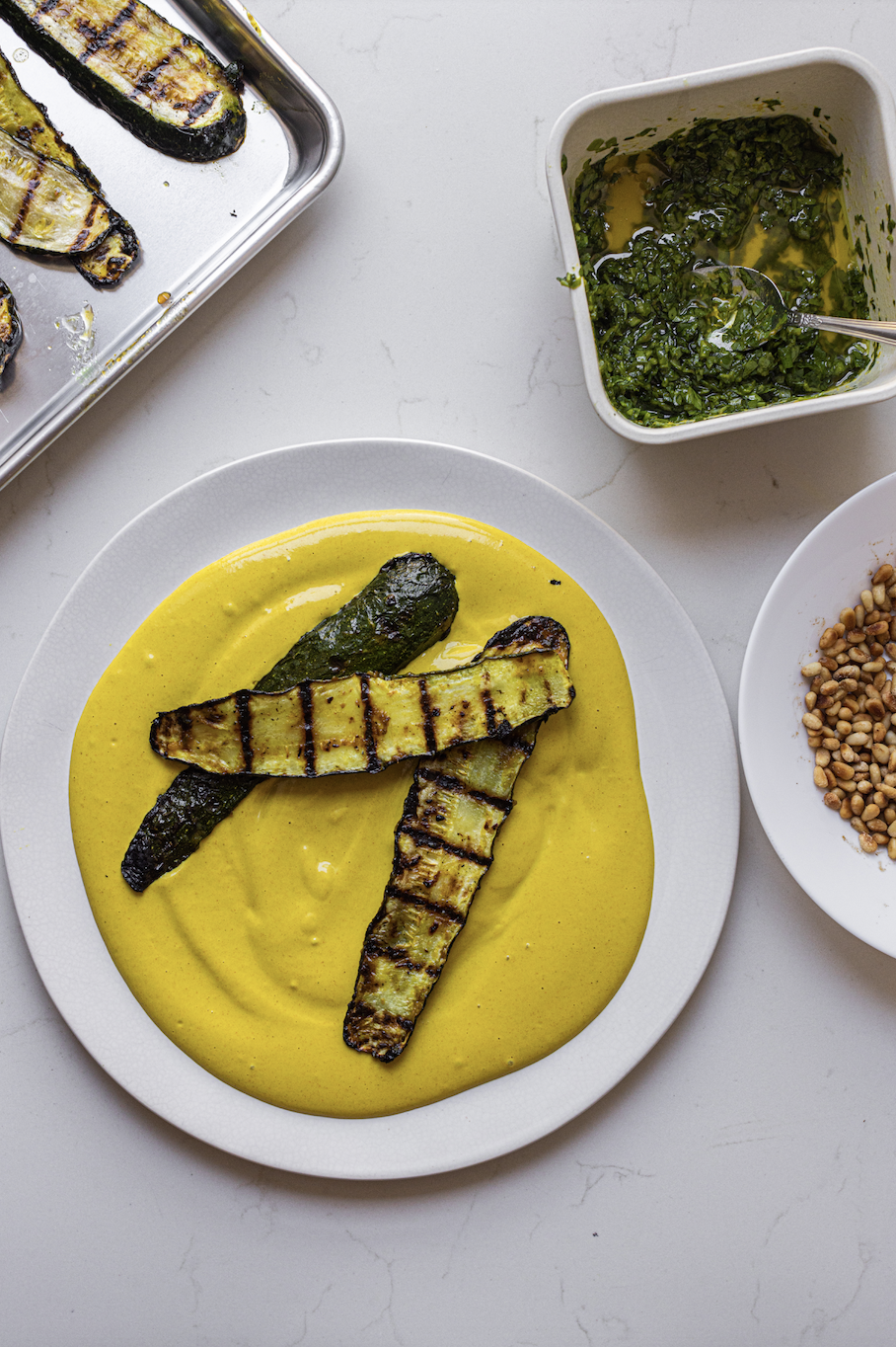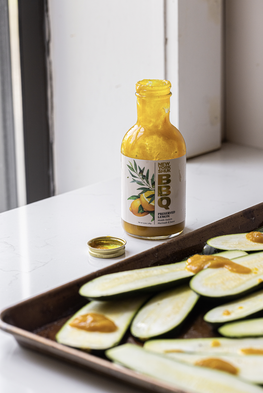 To prepare the zucchini, cut each zucchini lengthwise into 4 slices about ¼ inch wide. Place the zucchini in a single layer on a baking sheet. Coat on both sides with the olive oil and Preserved Lemon BBQ Sauce, then sprinkle with the salt.