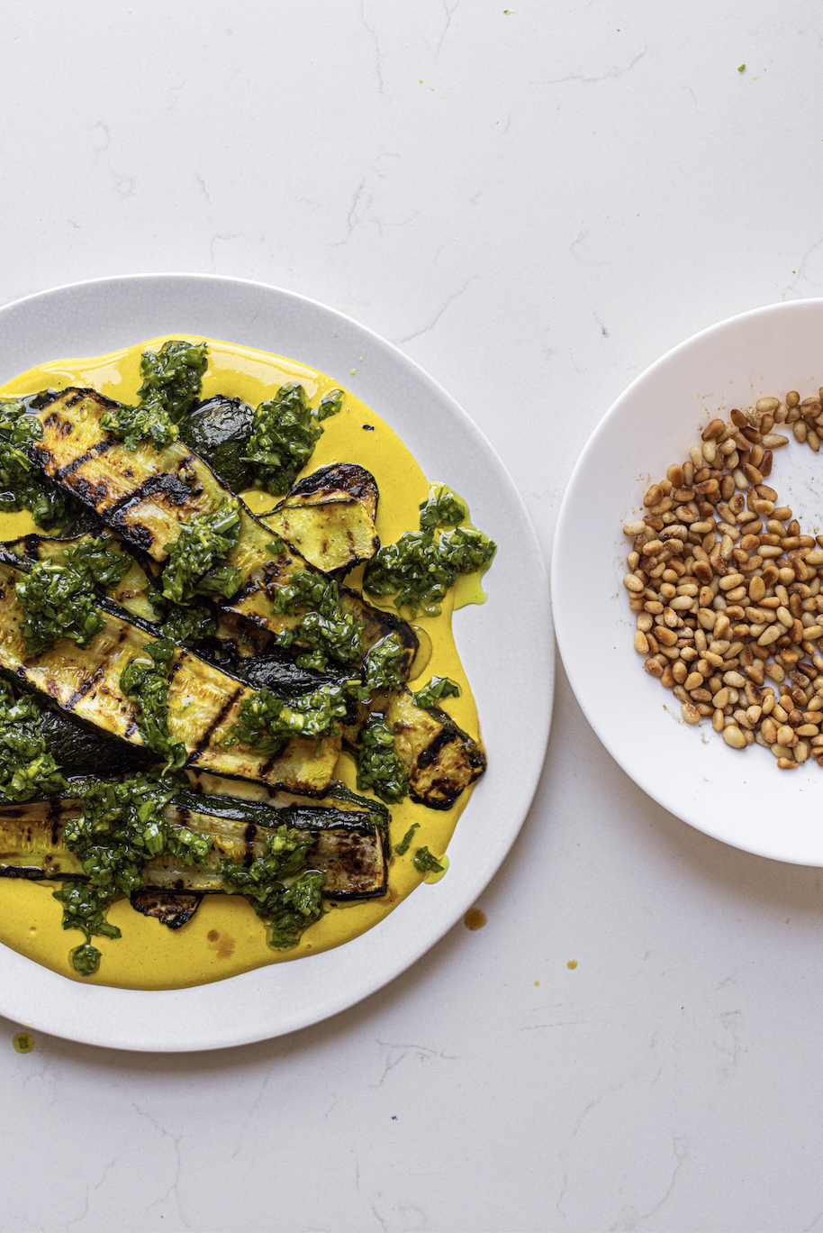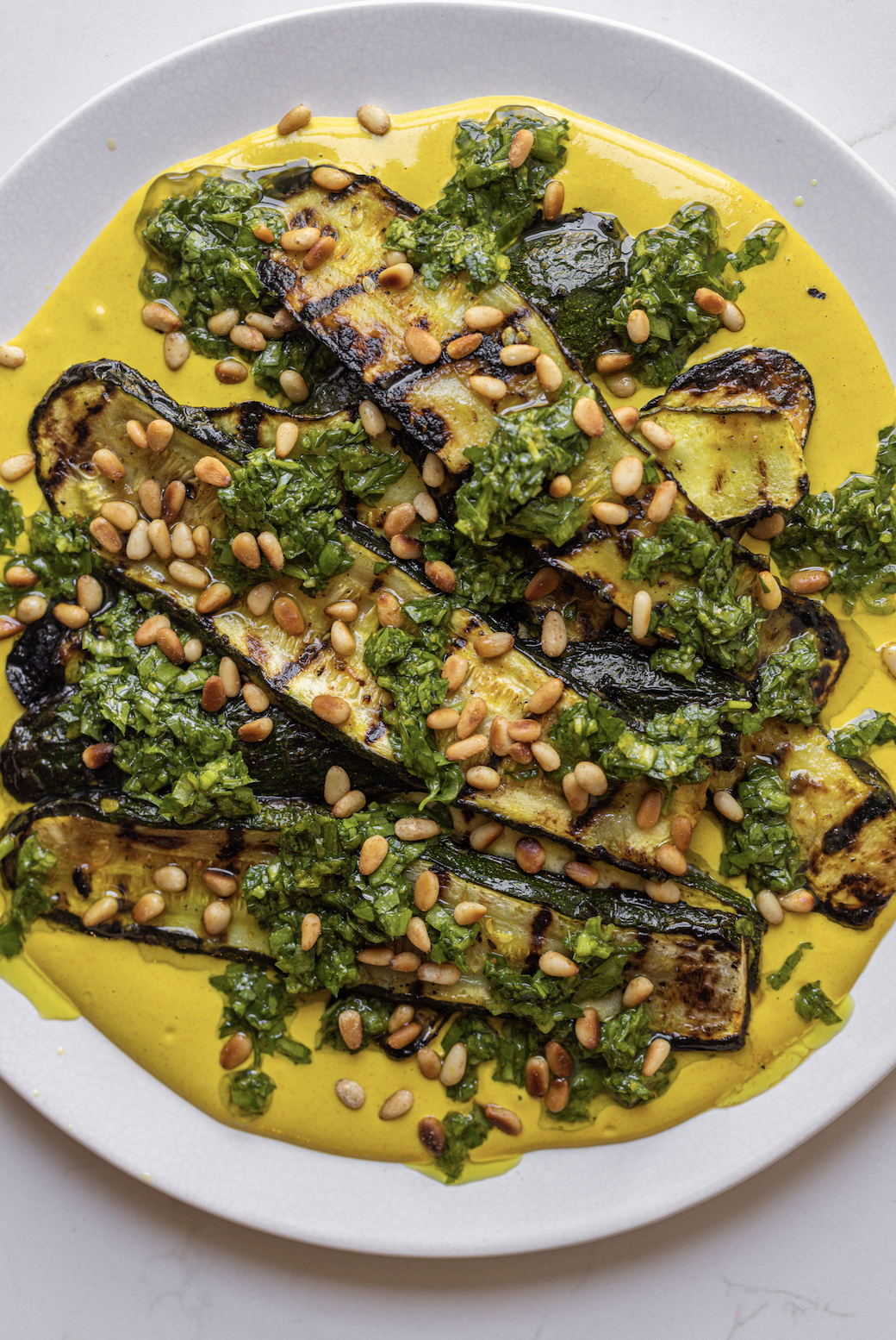 To assemble, spread the tahini on a serving plate and arrange the zucchini on the tahini. Top with the herb salsa and sprinkle with the pine nuts and cheese (if using).