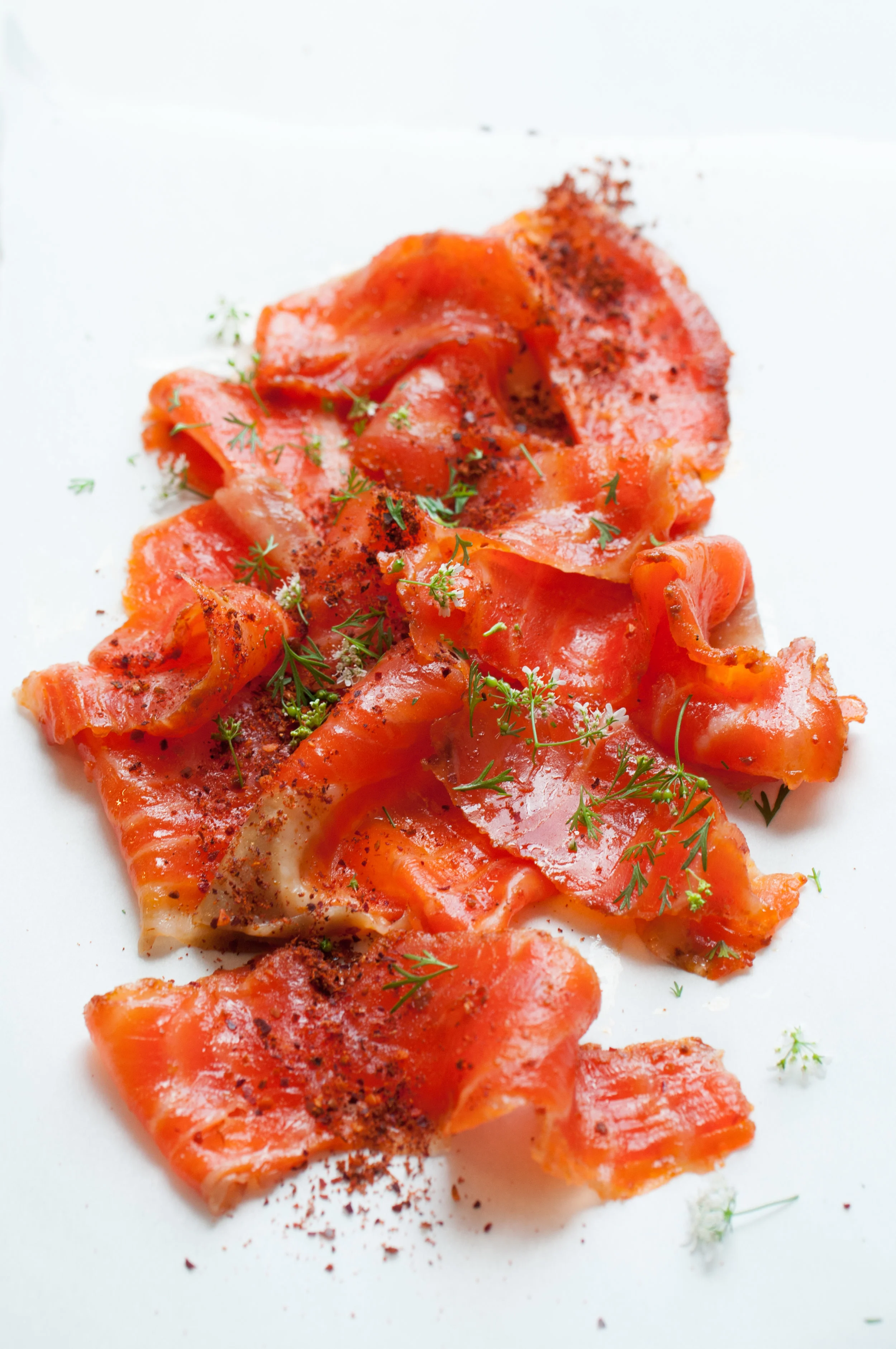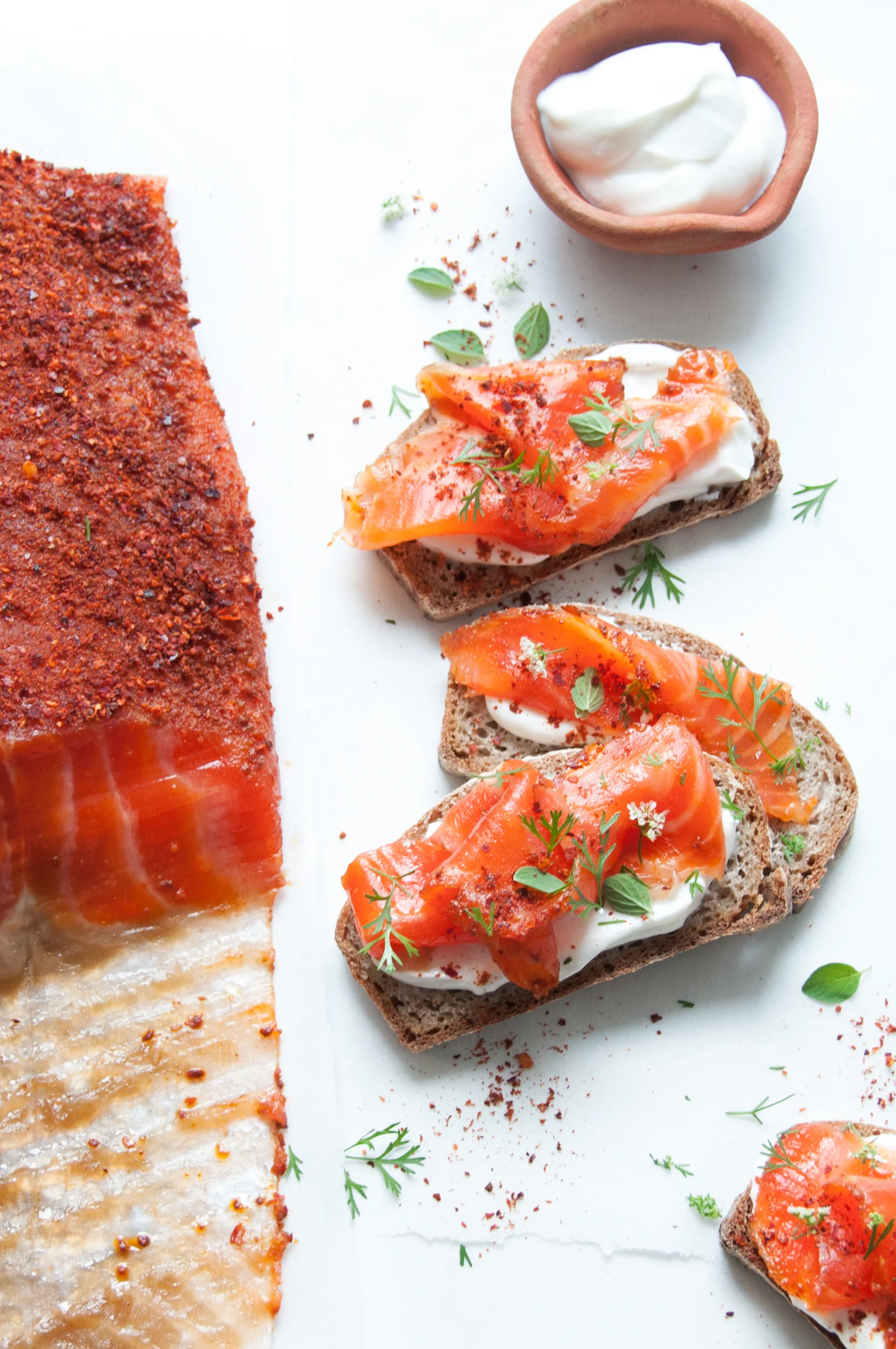 2. Rinse salt and sugar cure from the salmon and pat it dry with a clean dishtowel. Rub the remaining 5 tablespoons harissa on top of the cured salmon before serving and slicing.