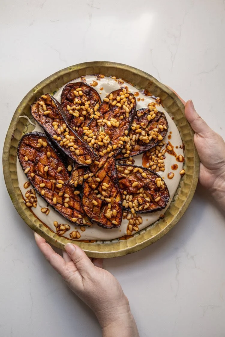 Harissa-Date Glazed Eggplant with Tahini & Pine Nuts