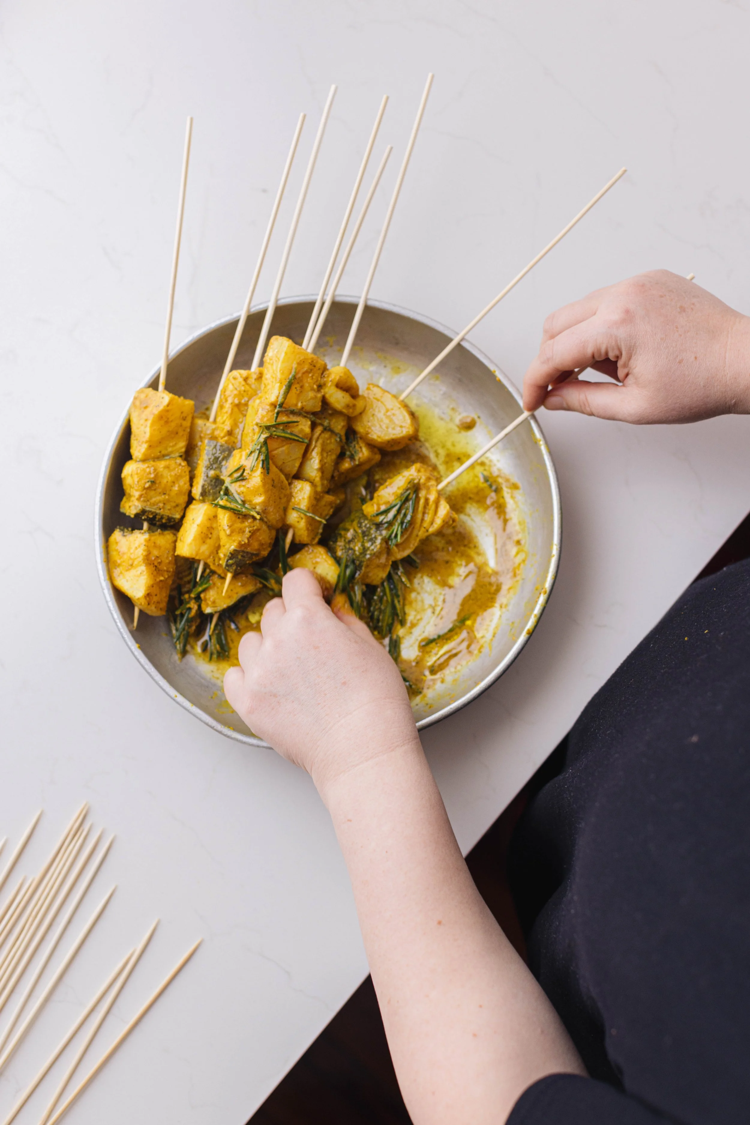 If you are planning to use an outdoor grill, submerge the wooden skewers in cold water; let soak for at least 30 minutes before threading the fish onto the skewers.