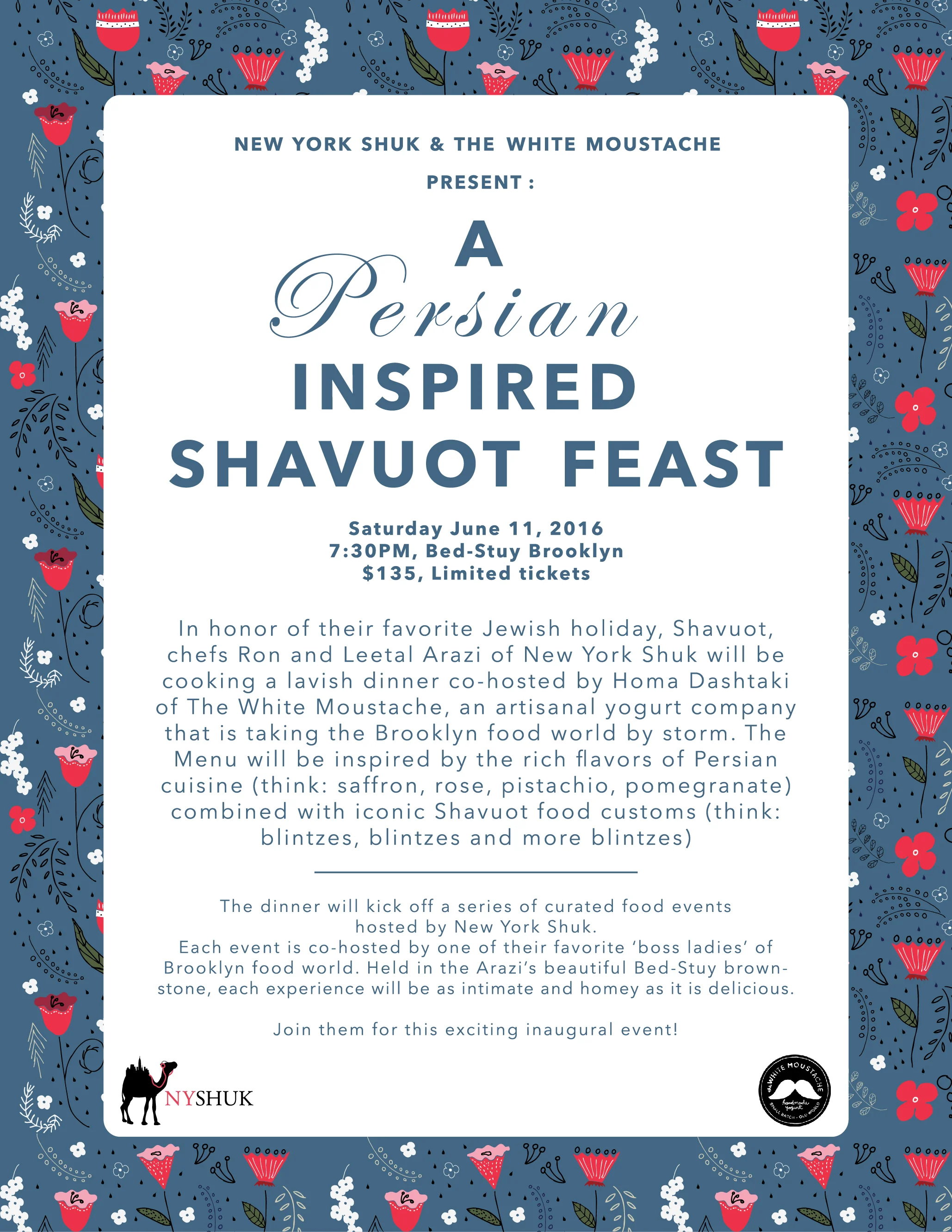 I am thrilled to share with you that we are starting a new series of curated events where we will be collaborating with some of our favorite ladies in the food world. Homa, founder of The White Moustache, will co-host our first dinner. Homa makes yogurt like you NEVER tasted before and we couldn’t be more excited to work together and bring you our take on a Persian feast celebrating the Jewish holiday of Shavuot. Let the fun begin.
