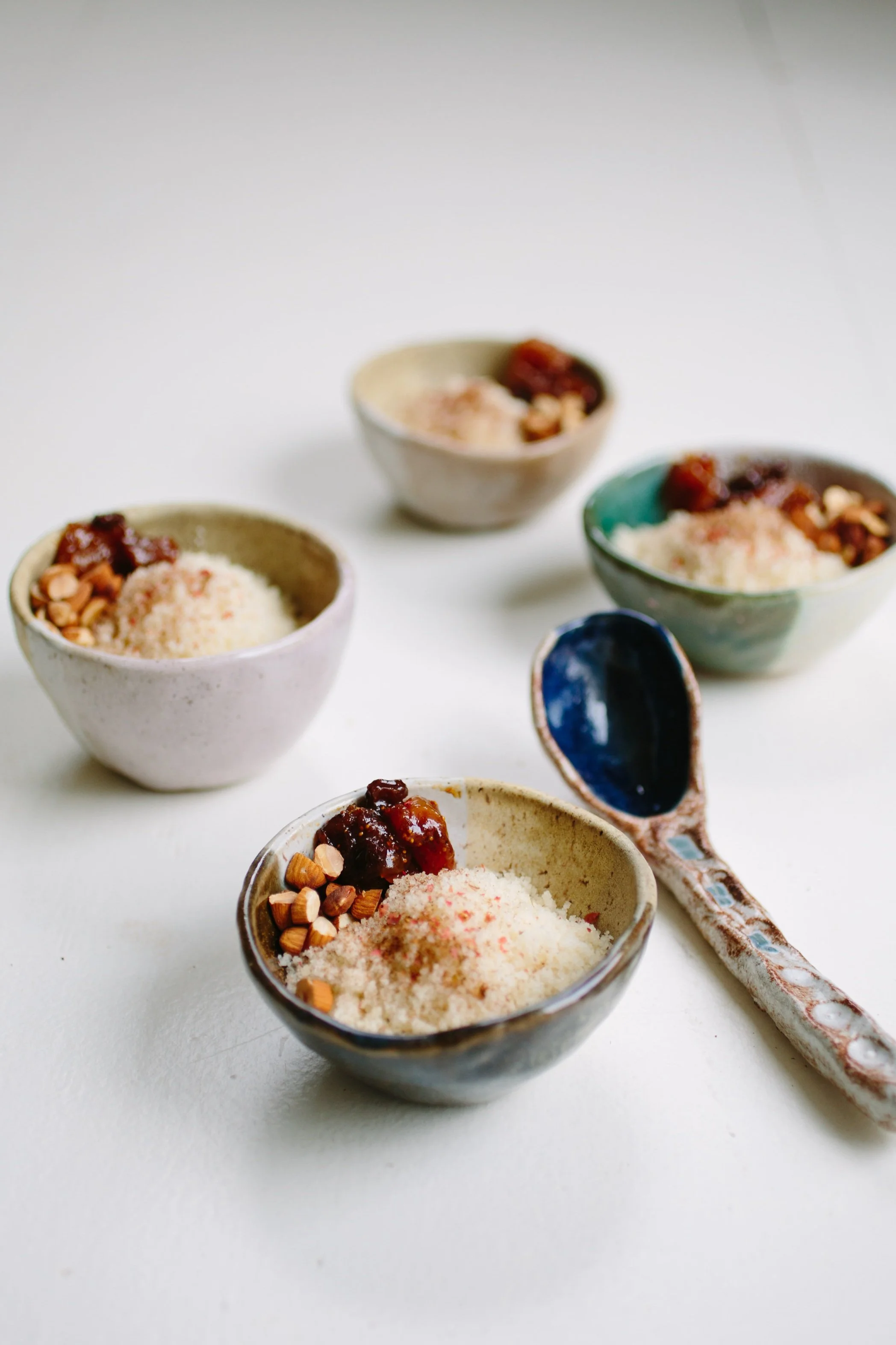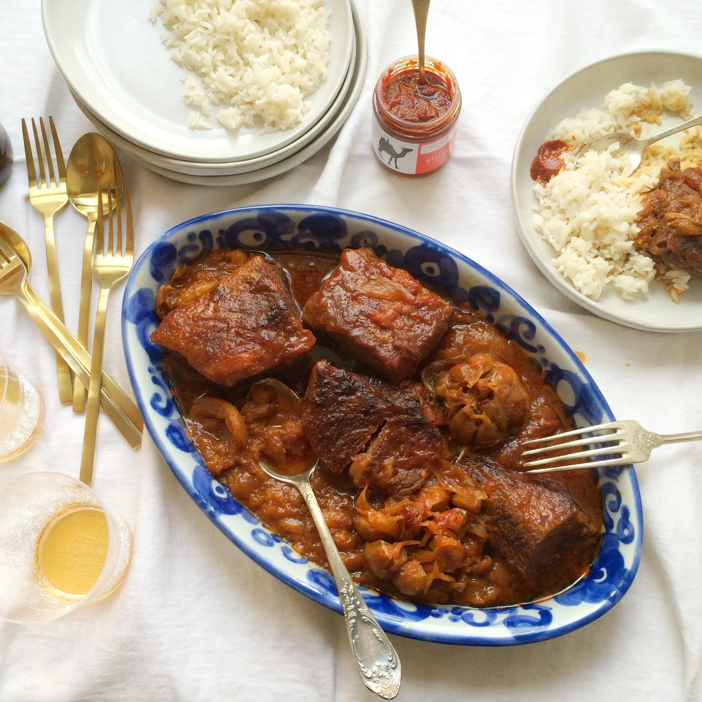 Tanzeya is a Rosh Hashanah staple at Ron’s house. It’s a chutney-like dish made with a variety of dried fruits (typically figs, apricots, prunes, and raisins) cooked with sugar syrup and mixed with caramelized onions. Enjoy it served over rice or couscous.