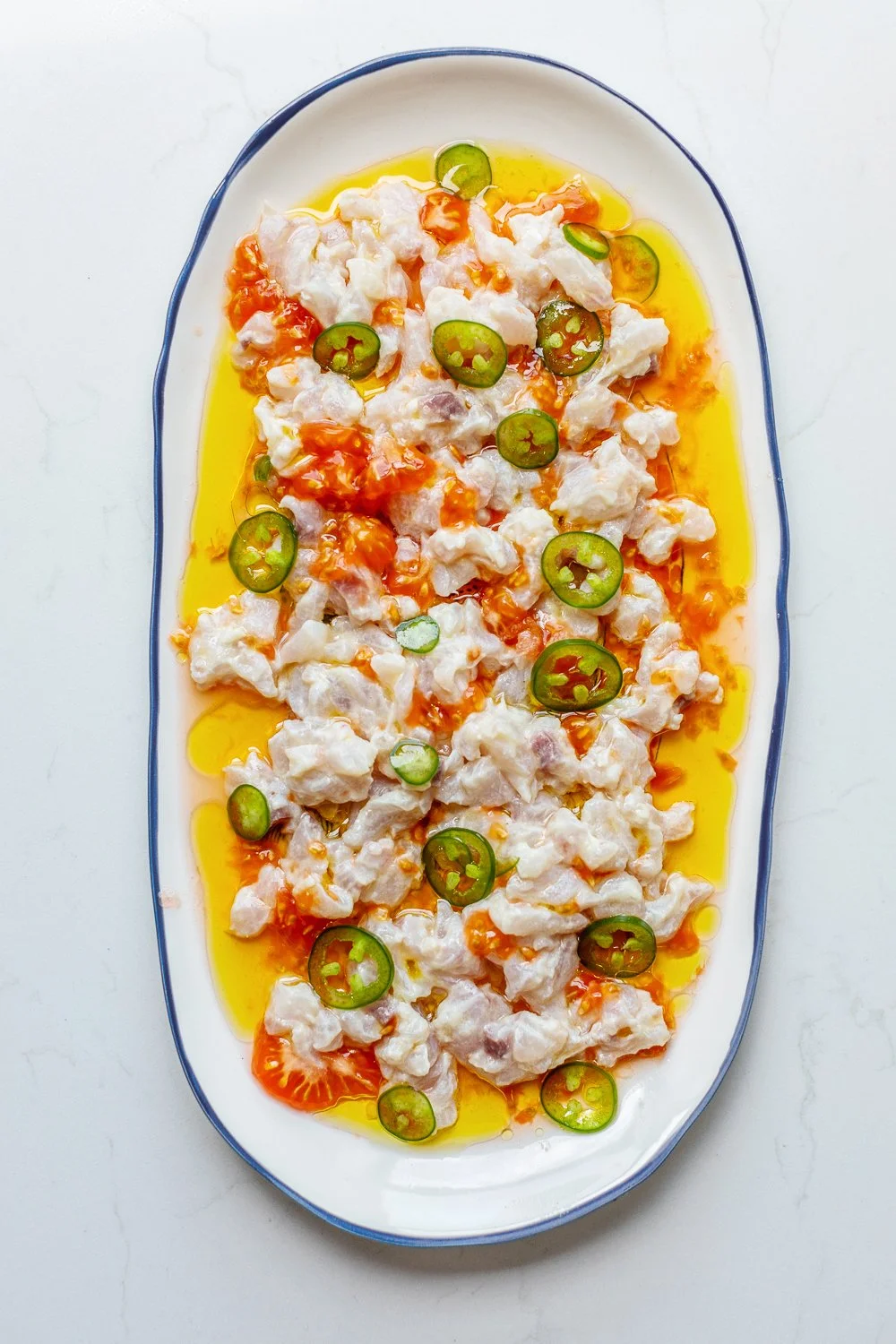 Matbucha Halibut topped with Raisins, Capers, Olives, And Pine Nuts