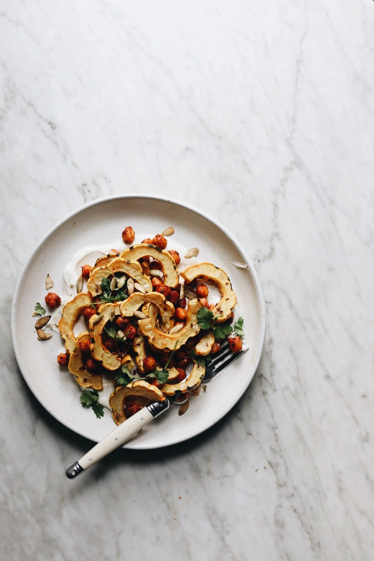 Cumin-Maple Roasted Delicata Squash with Harissa Chickpeas and Lime Yoghurt