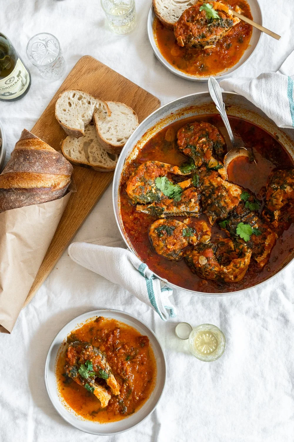 When tender fish is cooked in a rich, spiced tomato sauce and fresh herbs, the result is beyond perfection. Serve it with a thick slice of bread to soak up all the tomato-ey deliciousness.