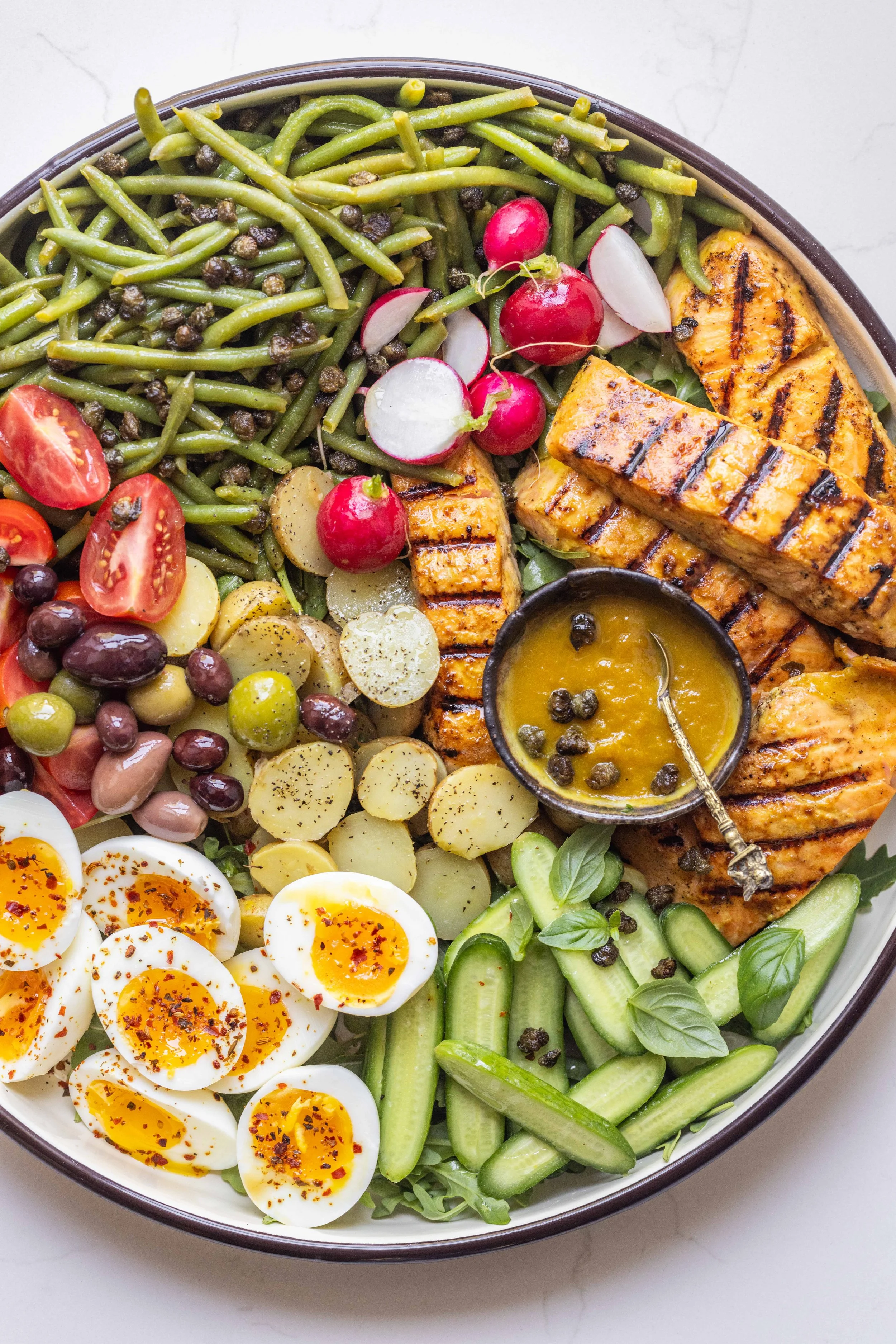 To assemble, season the cucumbers, tomatoes and potatoes with salt. Season the eggs with salt and Herby Harissa. On a large serving platter, layer all of the various components: Start with the arugula and then add the salmon, cucumbers, tomatoes, potatoes, eggs and green beans. Top with the olives and radishes, then sprinkle on the fried capers. Serve more Preserved Lemon BBQ Sauce on the side.