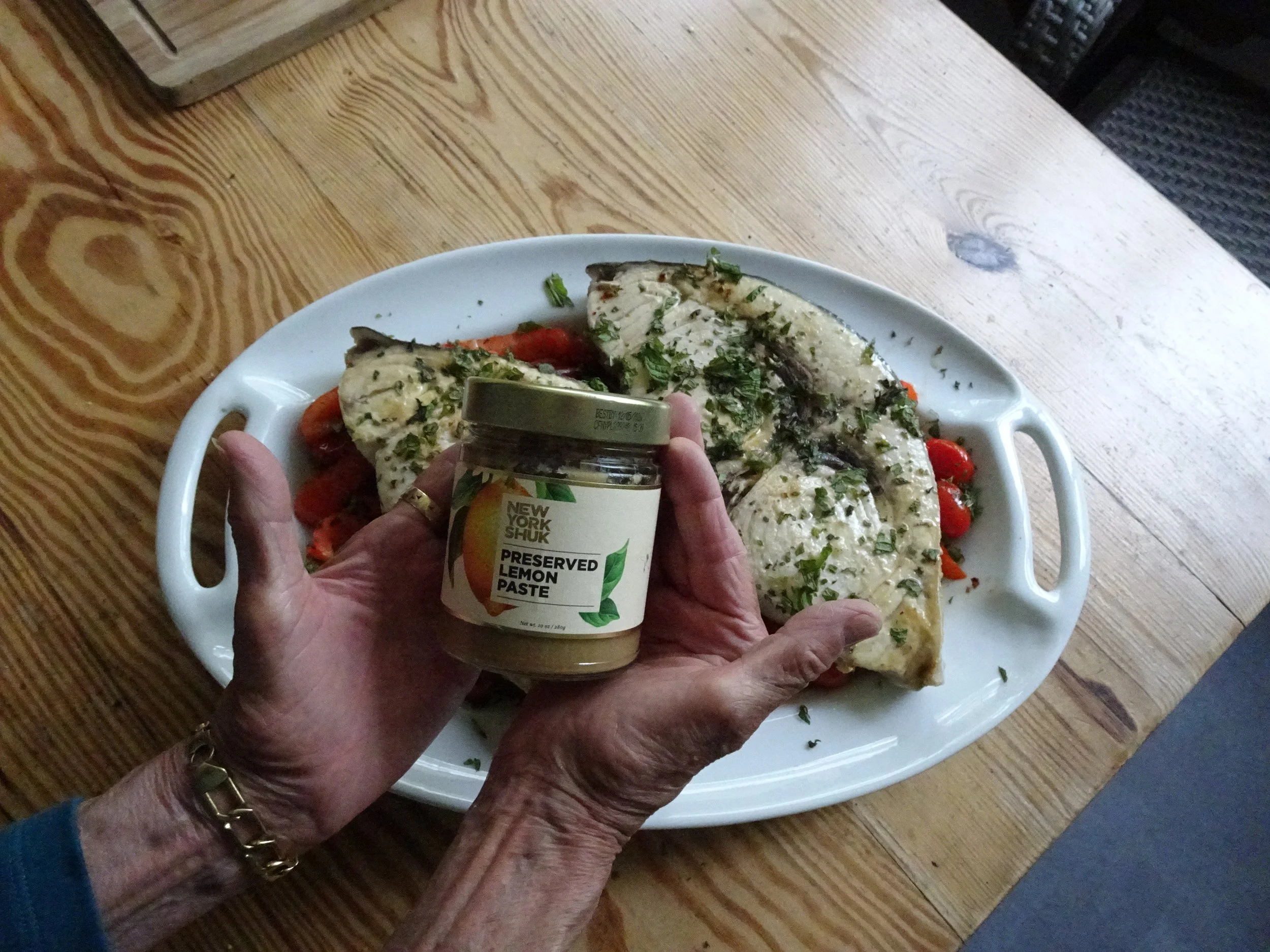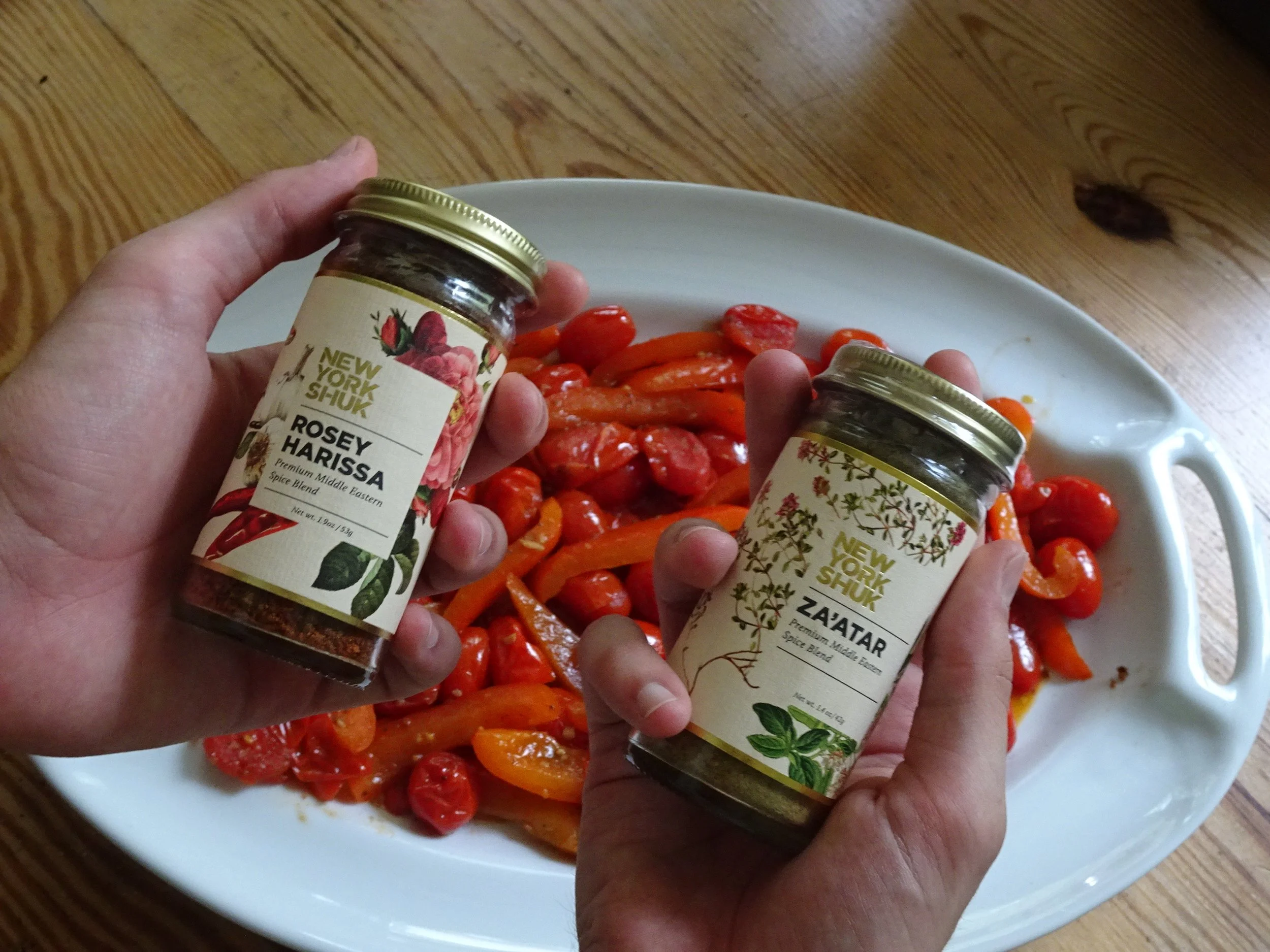 We kept it simple: seasoned the raw fish with Preserved Lemon Paste, then pan-seared it until golden and just cooked through. Underneath, we layered a warm mixture of red peppers and cherry tomatoes, cooked down with Rosey Harissa and a generous sprinkle of za’atar. The sweet, smoky vegetables soaked up the fish juices, and the lemon brought it all to life.