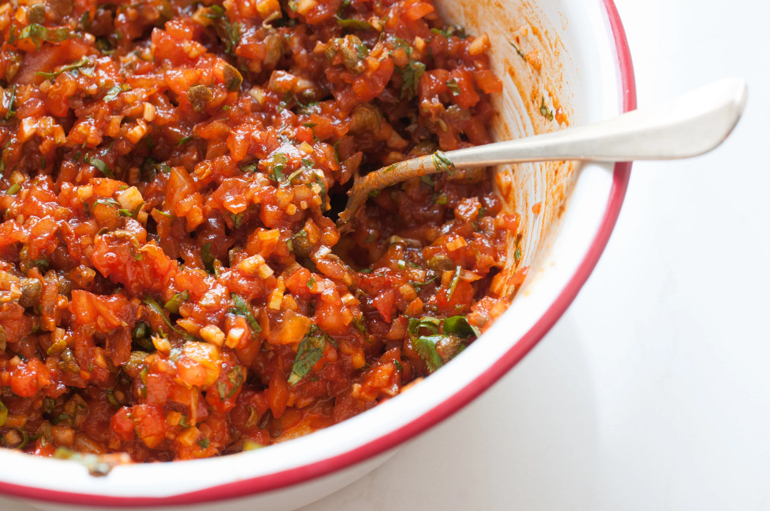 Tuna Balls In A Tomato, Eggplant & Harissa Sauce