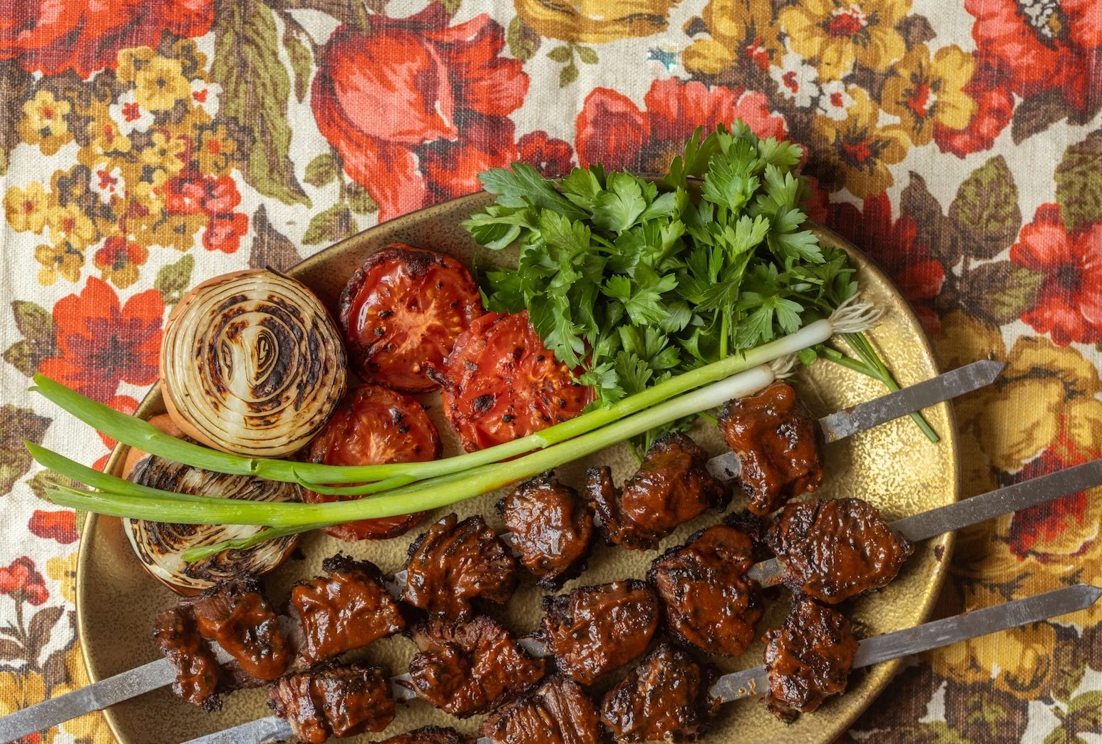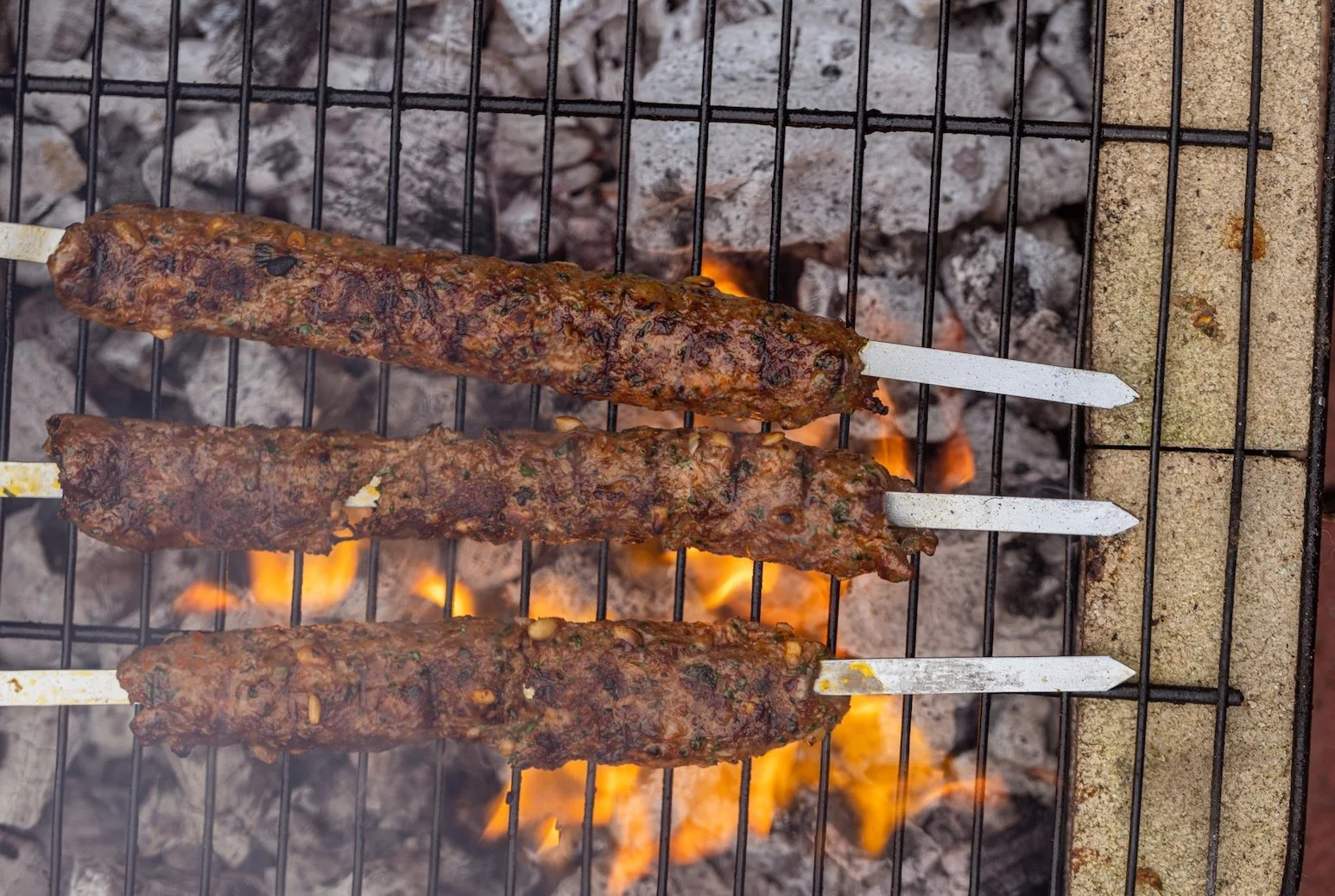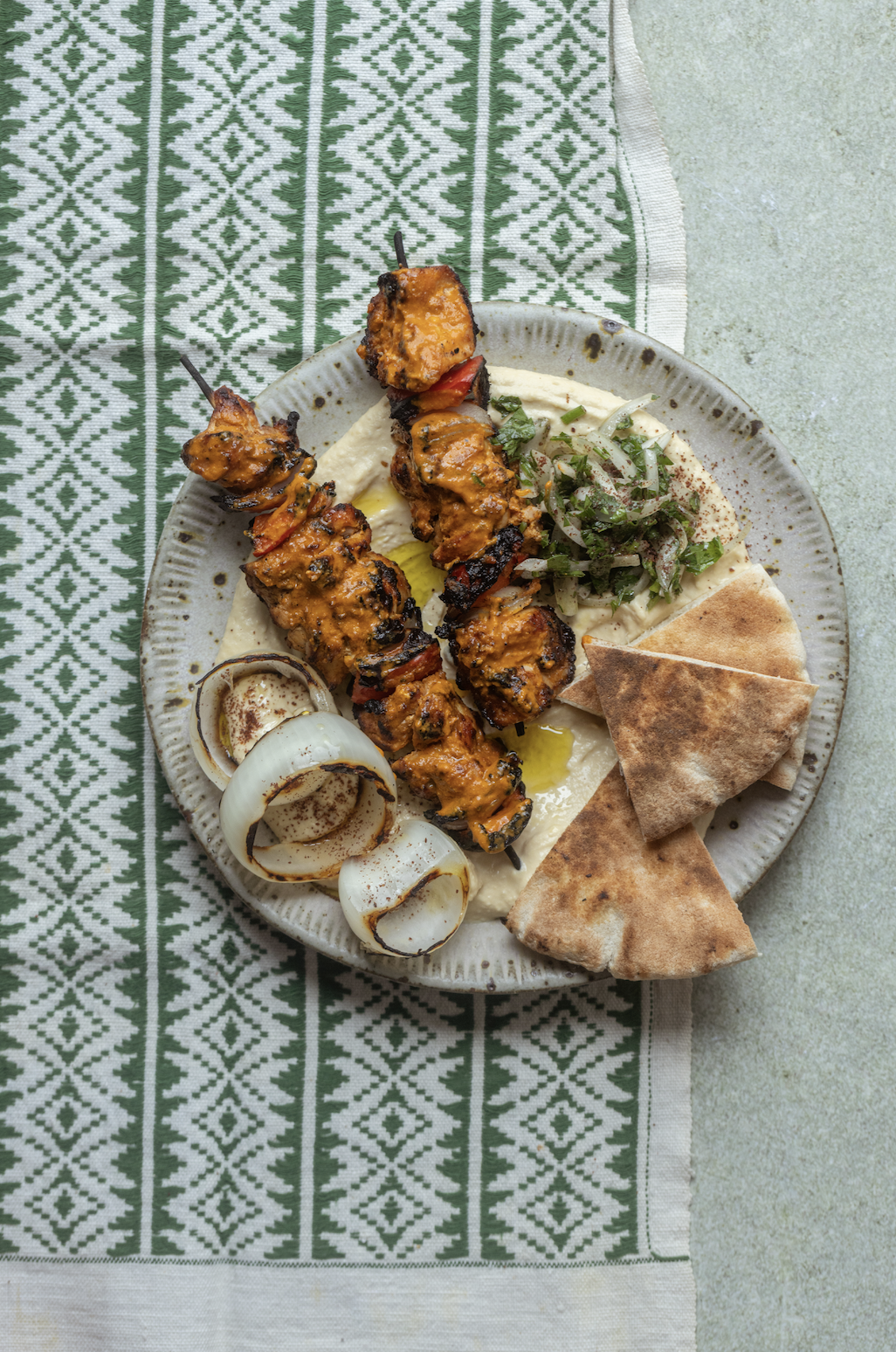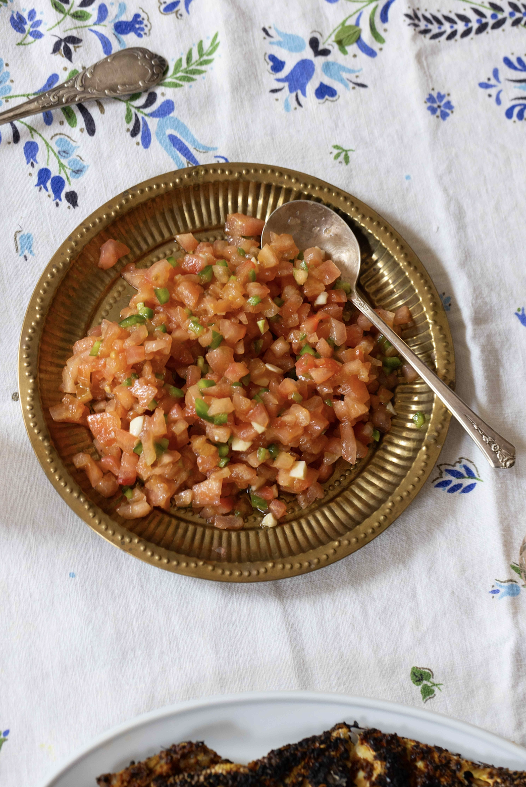 Hawaij Fish Kebab, Tzatziki and Grated Tomatoes