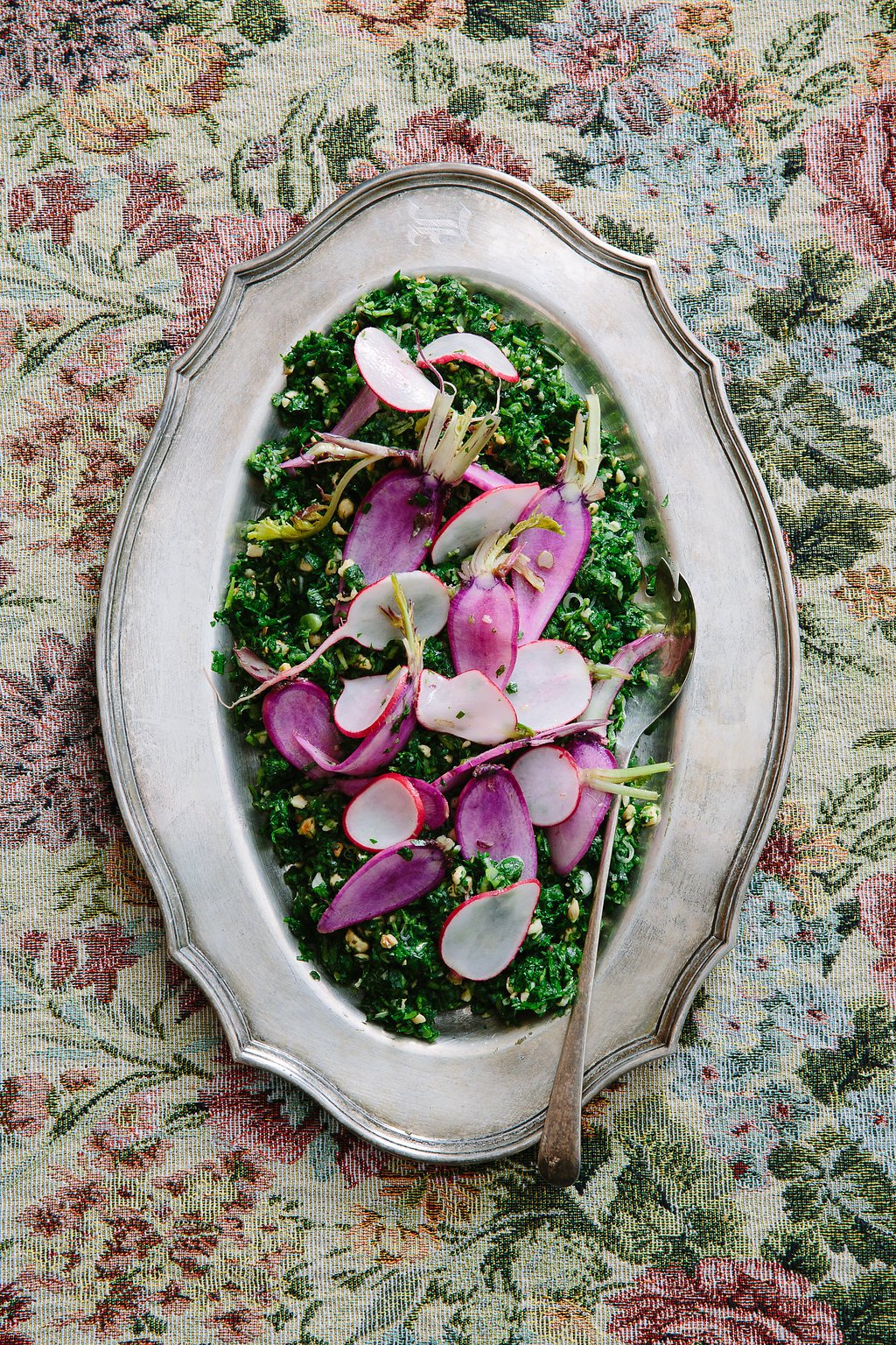 All the fresh-herb goodness of tabbouleh is captured in this delicious dish that sidesteps glutenous bulgur wheat with a paleo-friendly use of chopped toasted hazelnuts. (If you can’t find them already toasted, toast them in one layer on a baking sheet for 15 minutes at 350°F.) You can also use walnuts or pistachios and swap the radish garnish with pomegranate arils.